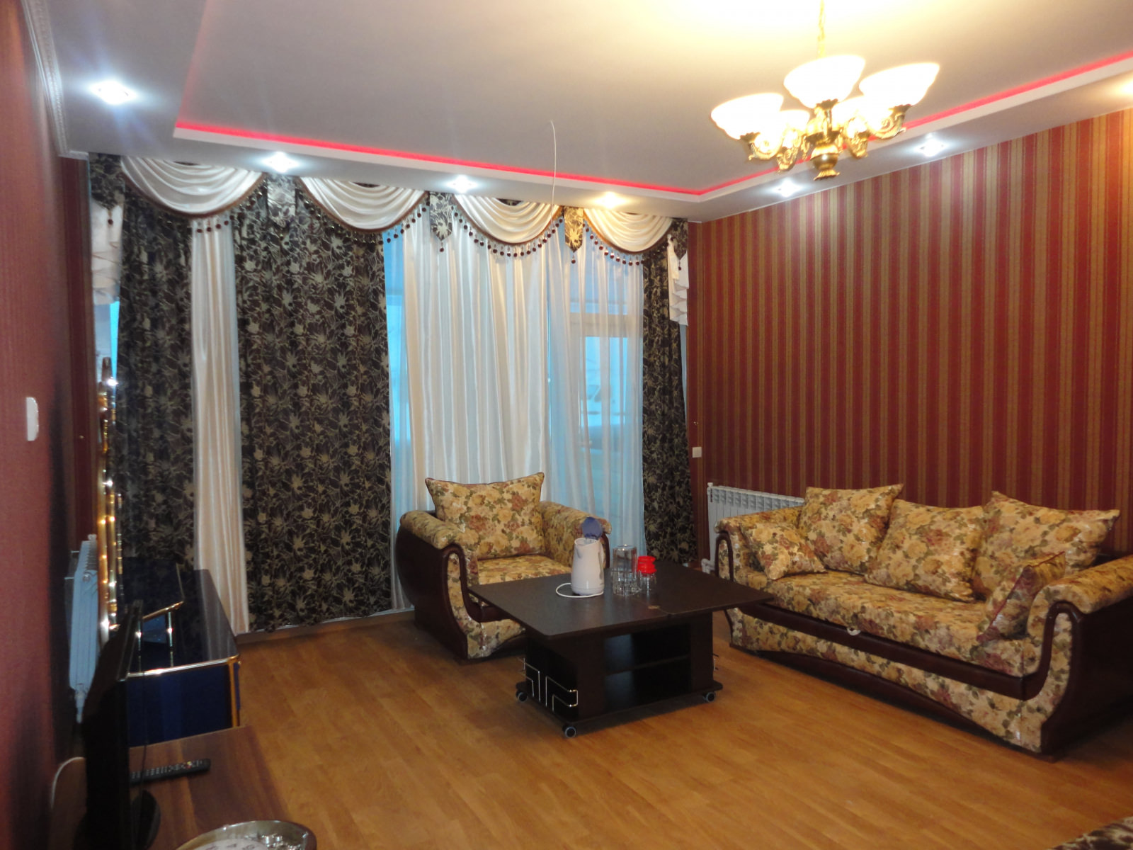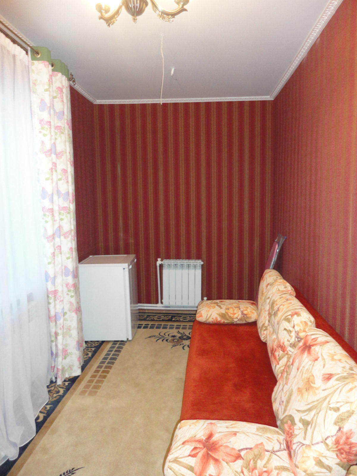1 осн. место. 2 доп. места. Балкон. Мебель: вешалка, диван раскладной, зеркало, кровати полутороспальные, кровать двуспальная, столик журнальный, столик туалетный, стулья, тумба под телевизор, шкаф. Оборудование: гладильная доска, телевизор, телефон, утюг, холодильник, чайный набор посуды, электрочайник. Санузел: с душем, туалетные принадлежности, фен. Сервис: смена полотенец (1 раз в 3 дня), смена постельного белья (1 раз в 5 дней), уборка номера (ежедневно), услуги телефонной связи по территории отеля.