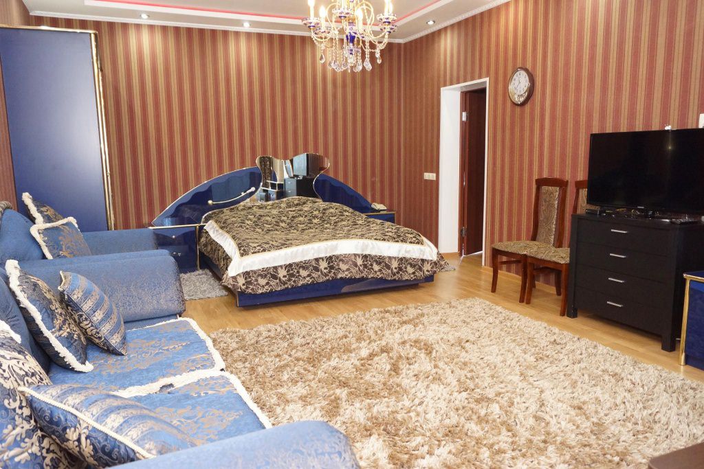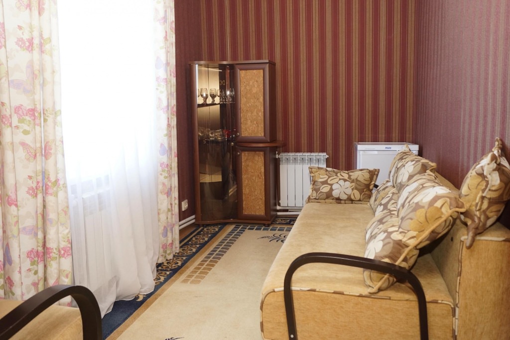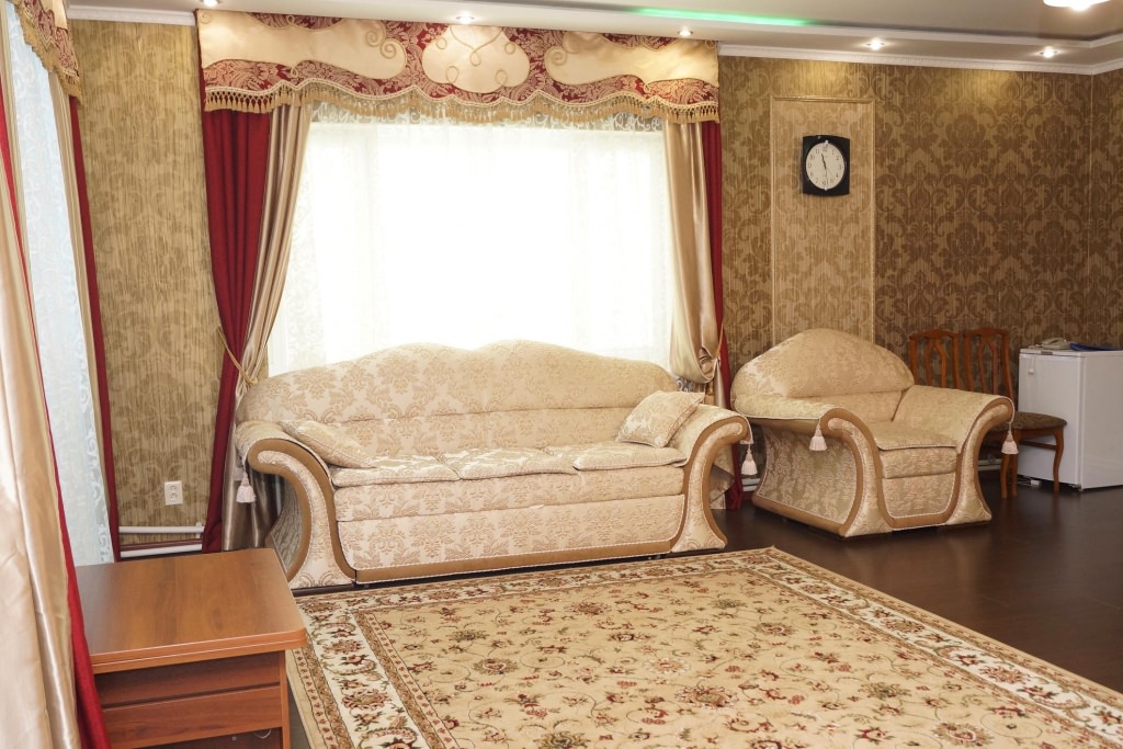 2 осн. места. 2 доп. места. Мебель: вешалка, диван, зеркало, кровать двуспальная, столик журнальный, стулья, шкаф. Оборудование: гладильная доска, телевизор, телефон, утюг, холодильник, чайный набор посуды, электрочайник. Санузел: с ванной, туалетные принадлежности, фен. Сервис: смена полотенец (1 раз в 3 дня), смена постельного белья (1 раз в 5 дней), уборка номера (ежедневно), услуги телефонной связи по территории отеля.
