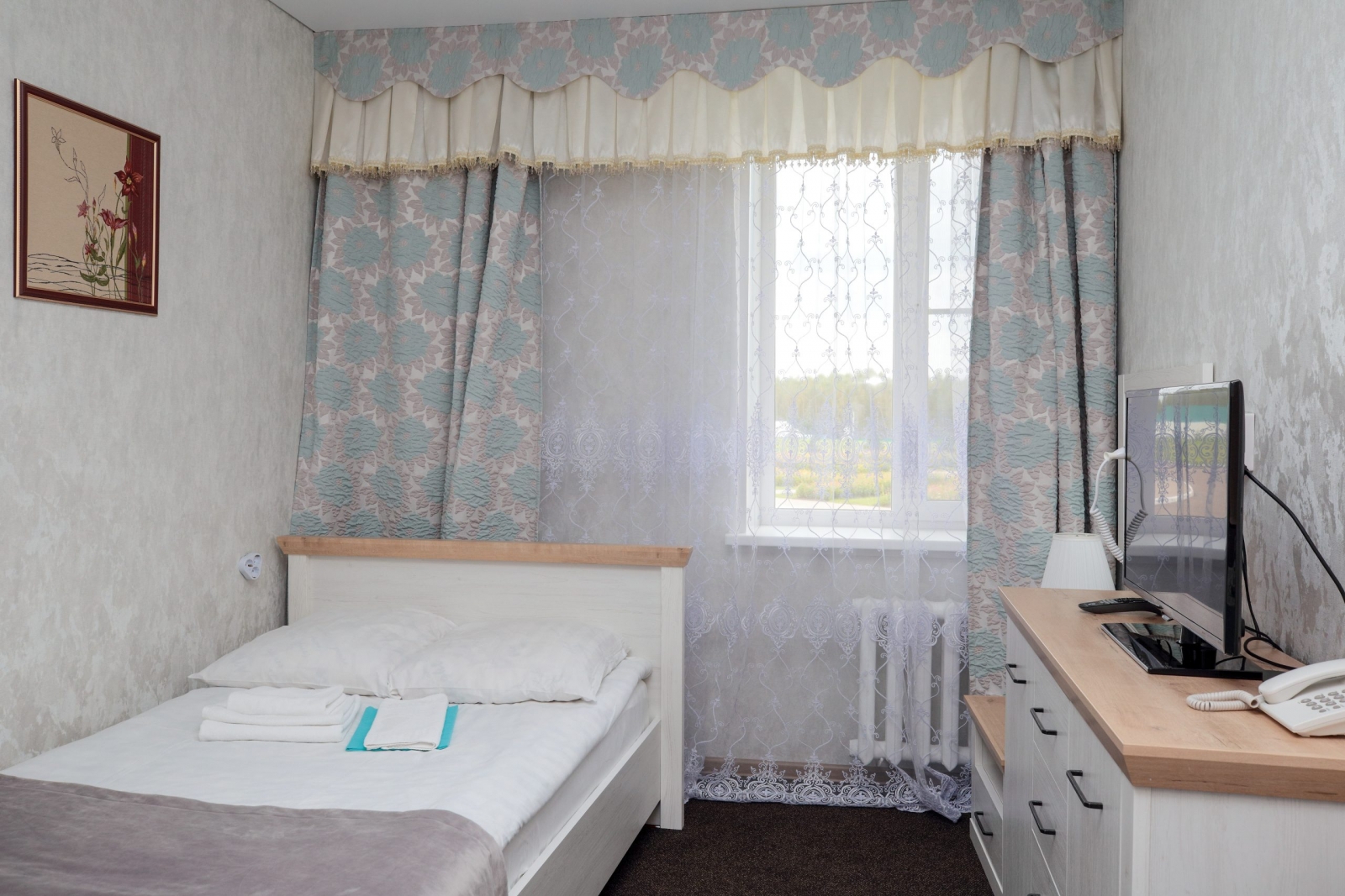 1 осн. место. 2 доп. места. Мебель: зеркало, кровать полутороспальная, прикроватные тумбочки, стол, стул, шкаф-купе. Оборудование: набор посуды, телевизор, телефон, холодильник, электрочайник. Санузел: с душем, туалетные принадлежности, фен. Сервис: смена полотенец, смена постельного белья, уборка номера, услуги телефонной связи по территории отеля.